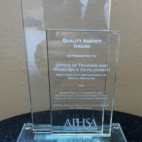 The NYC Department of Social Services (DSS) Office of Training and Workforce Development (OTWD) received the Quality Agency Award for exceptional leadership and educational contributions to the field of health and human services.