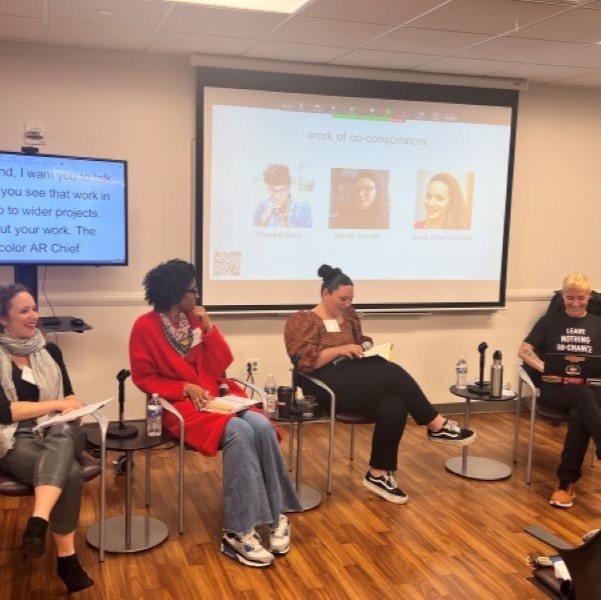 The evening began with Dr. Zeller-Berkman’s opening remarks and introductions to Dr. Bishop, a noted educator, researcher, writer, and youth advocate, and the two outside panelists. Dr. Barrales is an Ethnic Studies teacher, scholar-activist, and founder of the WOCArchive who works to center her immigrant family’s stories in her research, community organizing, and classroom. Damaris Dunn is a scholar pursuing her doctorate at the University of Georgia. Her research interests are educational equity and Black girl joy.
